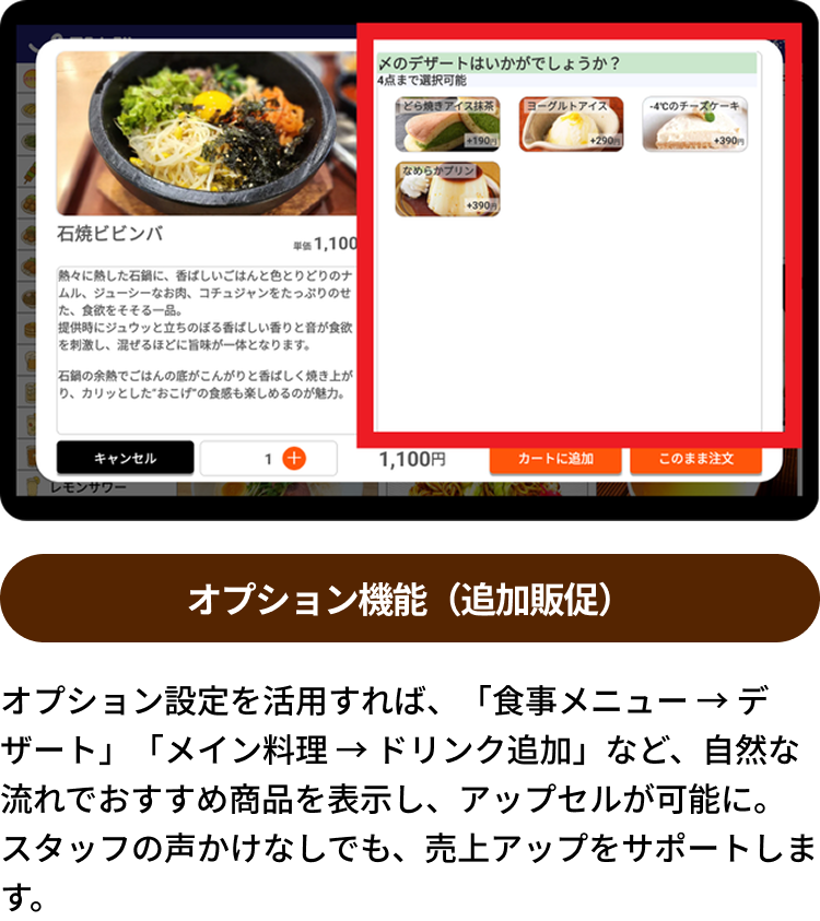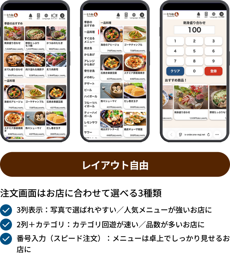 管理画面からのメニュー入れ替えや追加も簡単で、季節メニューや日替わりメニューにも柔軟に対応できます。